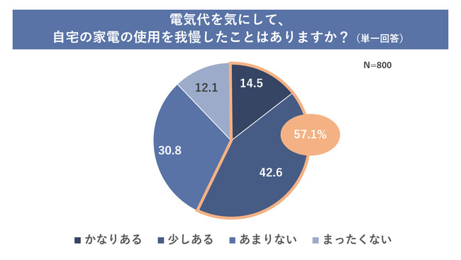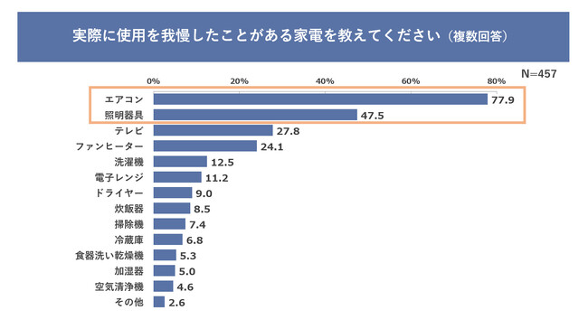 そんな中、電気代を気にして家電の使用を我慢したことがあるかどうかを聞いたところ、「かなりある」「少しある」を合わせると57.1%の人が家電の使用を我慢したことがあると回答しました。実際に使用を我慢したことがある家電を聞くと、「エアコン」が77.9%と1位、次いで「照明器具」が47.5%という結果になりました。快適な室温にしてくれるエアコンと、日常生活では欠かせない照明の使用を我慢することが上位に入っており、生活の基盤となる家電までも電気代のためには我慢せざるを得ないようです。