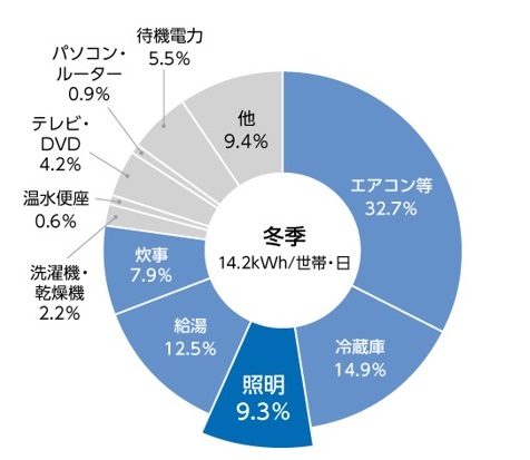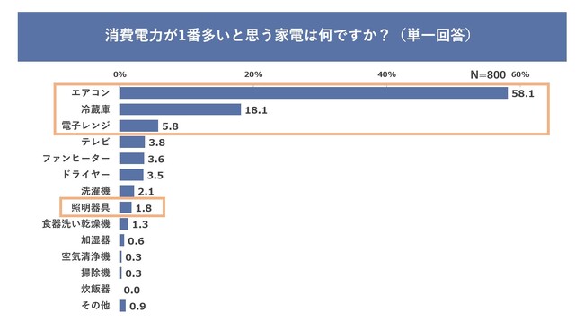 消費電力が最も大きいと思われる家電を聞いたところ、1位は58.1%でエアコン、2位は18.1%で冷蔵庫、3位は5.8%で電子レンジという結果となりました。一方、わずか1.8%の回答となった照明器具は、実際には電力消費割合の約9.3%(冬季)を占めます。部屋の数だけ設置されていて、在宅時は使用時間も長くなることで意外にも消費電力が大きいことがわかります。
