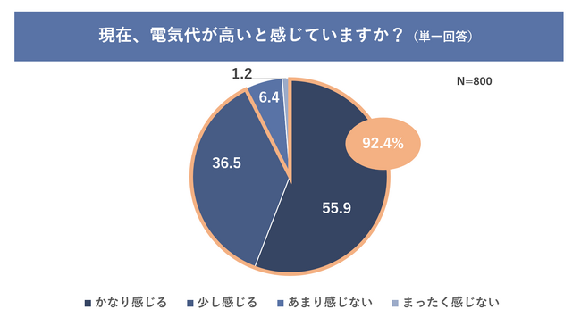 まず、現在の電気代について「高い」と感じているかどうかを聞いたところ、「かなり感じる」と「少し感じる」を合わせると92.4%に達し、大多数の人が電気代が高いと感じていることがわかりました。