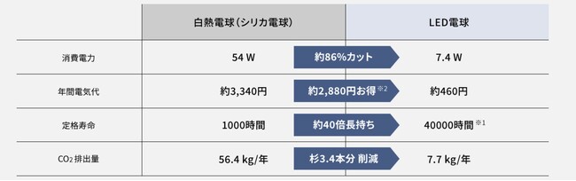 ※3 当社LED電球LDA7L-D-G/S/Z6/F(定格消費電力7.4W、定格寿命40000時間)とJIS規格一般照明用白熱電球60形(定格消費電力54W、定格寿命1000時間)との比較。1日5.5時間、年間2,000時間点灯、使用電力料金(目安単価)31円/kWh(税込)[2022年7月改定]で計算。当社調べ。使用条件により変わることがあります。