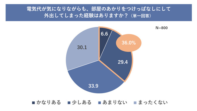 そして、電気代を気にしながらも、部屋のあかりをつけっぱなしにして外出してしまった経験がある人は、「かなりある」「少しある」を合わせて36.0%と、3人に1人がつけっぱなしで外出してしまった経験があるという結果に。節電意識はあるものの、実際は外出時のあわただしさで消し忘れてしまうこともあることがわかりました。