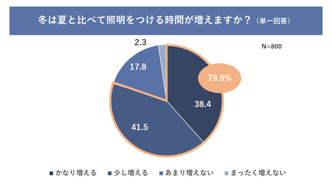 ・冬は部屋の照明器具をつける時間が夏と比べて増えると回答した人は8割に。その中でも半数以上の人が2時間以上長く照明器具を長くつけていることが判明。日照時間が短い冬はどうしても点灯時間が長くなってしまう傾向。