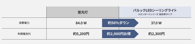 A_ 代表機種での試算例になりますが、リビングなどでの使用を想定すると、蛍光灯器具からLEDシーリングライトに取り替えると、電気代が年間で約2,900円、10年で約29,000円もお得になります※1。(当社比)ご自宅の照明器具がまだ使えるから勿体ないという気持ちもあるかも知れませんが、照明器具も家電製品同様に経年での内部劣化が進みますので、予期せぬ故障などのトラブルの可能性も増えてきます。また、早く取り替える事によって、電気代削減の効果も早く出てきますので、早めのLED化のご検討を推奨します。