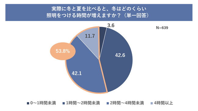 照明が占める消費電力の割合は意外にも高いことがわかりましたが、 冬は夏と比べて部屋の照明をつける時間が増えるかどうかを聞いたところ、「かなり増える」「少し増える」を合わせると79.9%の人が照明をつける時間が長くなると回答しました。どのくらい照明をつける時間が長くなるかを聞いたところ、「2時間~4時間未満」が42.1%、「4時間以上」が11.7%となり、2時間以上増える人が53.8%と半数を超える結果となりました。やはり日照時間が短くなるのに伴い、照明をつける時間は長くなってしまうようです。