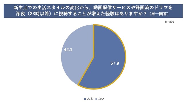 新生活での生活スタイルの変化から、動画配信サービスや録画済のドラマを深夜(23時以降)に視聴することが増えた経験があるかを聞いたところ、57.9%が「ある」と回答しました。さらに、動画配信サービスや録画したテレビ番組を深夜に見る理由を聞いたところ、「リラックスするため」が最多となり、日中の忙しい生活リズムから解放される時間帯に、心地よくリラックスしながらドラマを楽しむ人が増えていることが浮き彫りになりました。このことから、深夜はリフレッシュやストレス解消に費やす時間と考える人が多く、ドラマを見るための時間として定着しつつあることがうかがえます。