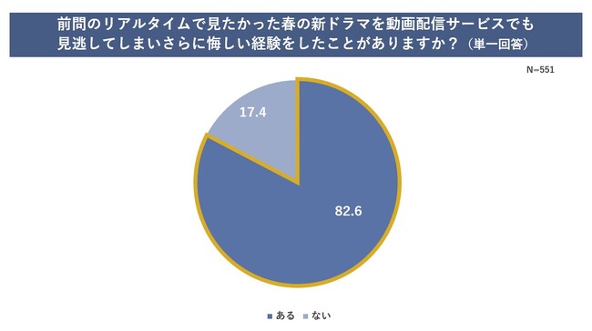 続いて、新生活が始まり生活リズムの変化を受け、リアルタイムで見たかった春の新ドラマを見逃してしまい悔しい経験をしたことがあるかを聞いたところ、「ある」と回答した人が68.9%と約7割に上りました。さらに、リアルタイムで見たかった春の新ドラマを動画配信サービスでも見逃してしまい悔しい経験をしたことがあるかを聞いたところ「ある」と回答した人が82.6%と8割を超え、新生活の忙しさがドラマ視聴にも影響を与えていることがわかる結果となりました。ドラマを見逃したときの悔しさを解消するために、録画機能や配信サービス活用のニーズも今後も高まることが予想されます。
