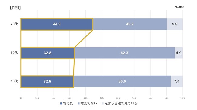 新生活の忙しさから、録画や動画配信サービスでドラマを視聴する際、倍速で見ることが増えた経験があるかを聞いたところ、36.3%が「増えた」と回答、3分の1以上の人が新生活シーズンは倍速でドラマを視聴した経験があることがわかりました。世代別で見ると、「20代」が44.3%、「30代」が32.8%、「40代」が32.6%という結果となり、倍速視聴は比較的若い世代に多い傾向があり、「タイパ」を重要視すると言われるように効率的にコンテンツを視聴する傾向が強いことがうかがえます。