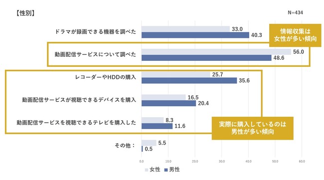 性別で見ると、「動画配信サービスについて調べた」などの情報収集は女性の方が多く、実際に録画機器を購入しているのは男性の割合が高いという結果になりました。