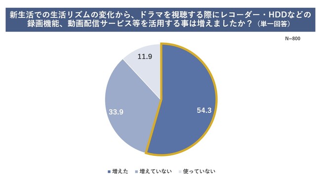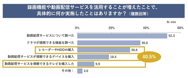 新生活での生活リズムの変化から、ドラマを視聴する際にレコーダー・HDDなどの録画機能、動画配信サービス等を活用する事は増えたかを聞いたところ54.3%が「増えた」と回答し、新生活スタート時は2人に1人が録画や配信サービスを活用していることが分かりました。さらに、録画機能や動画配信サービスの活用が増えたことで実施したことを聞くと、「レコーダーやHDDの購入」「動画配信サービスを視聴できるテレビを購入した」を合わせると40.5%が視聴のためにAV機器を購入したと回答しています。