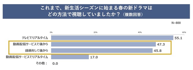 まず、これまで新生活シーズンに始まる春の新ドラマはどの方法で視聴していたかを聞いたところ、「テレビでリアルタイム」が55.1%で最多という結果に。しかし、「動画配信サービスで後から」が47.3%、「録画をしてから後から」が45.8%と、共に4割を超えており、忙しい新生活は自分のペースで視聴できる利便性の高さが求められる傾向にあることがわかりました。