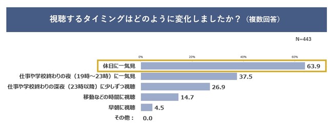 生活リズムの変化から春の新ドラマを視聴するタイミングに変化があったかを聞いたところ「ある」と回答した人は55.4%と半数以上に。さらに春の新ドラマを視聴するタイミングがどのように変化したかを聞いたところ、「休日に一気見」が63.9%で圧倒的に多い結果となりました。新生活シーズンは、忙しい平日に視聴できなかったドラマを休日にまとめて観る「一気見」のニーズが強まる傾向にあることがわかりました。