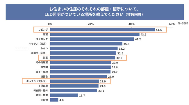 家族が集まるリビングでもLED照明に切り替えている方は、まだ約半数。浴室やキッチンなどではさらにLED化が進んでいないことが明らかになりました。