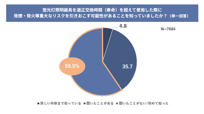 ・蛍光灯照明器具には適正交換時期(寿命)があり、超えて使用することによる発煙・発火のリスクが存在することを詳しく知っている人はわずか4.8%。6割近くが「聞いたことがない」「初めて知った」と回答。