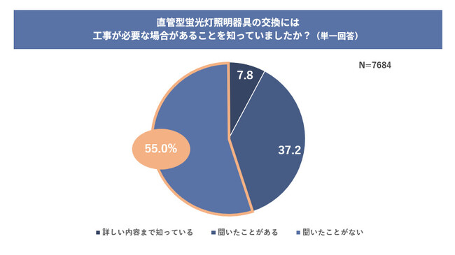 ・半数以上の人が直管蛍光灯照明器具の交換には工事が必要な場合があることを知らなかったと回答。
