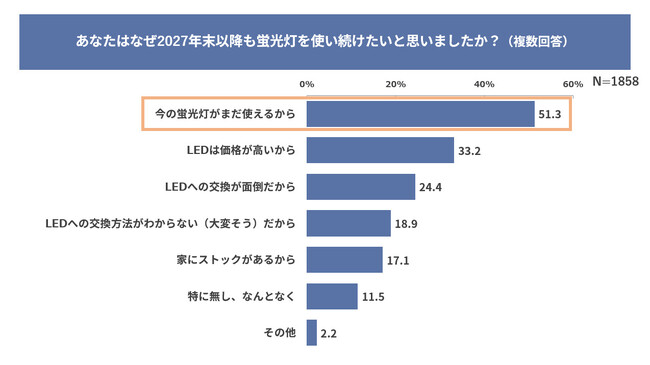 2027年末の蛍光灯の製造終了後も「丸形蛍光灯」や「直管型蛍光灯」などの蛍光灯を使い続けたいかを聞いたところ、約3人に1人(36.4%)が使い続けたいと考えていることがわかりました。その理由として、「今の蛍光灯がまだ使えるから」という回答が半数以上を占めました。今使っているものが使用できなくならない限りは、取り替える意向がないことが浮き彫りとなりました。