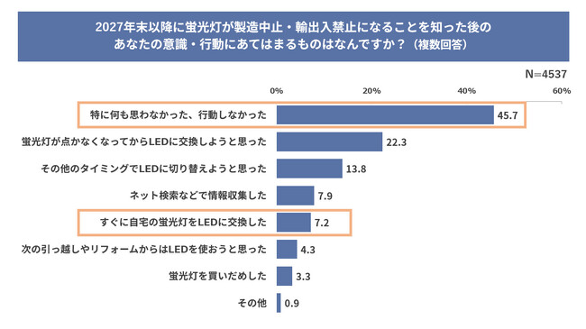 蛍光灯が製造中止・輸出入禁止になることを知った後、「すぐにLEDに交換した」のはわずか7.2%。45.7%が「特に何も思わなかった、行動しなかった」と回答。