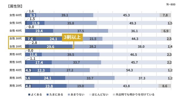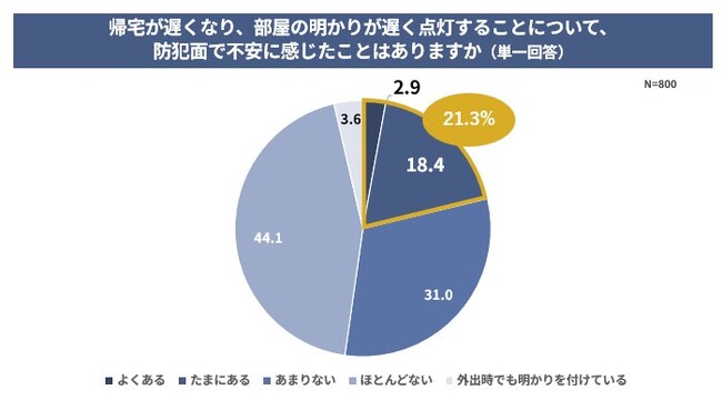 帰宅が遅くなり、部屋の明かりが遅く点灯することについて防犯面で不安に感じたことはあるかを聞いたところ、「よくある」「たまにある」を合わせると21.3%が回答。さらに属性別で見ると、特に20~30代女性においては3割以上が不安を抱えていることから、「帰宅したこと」や「帰宅時間がわかってしまうこと」への懸念がうかがえます。
