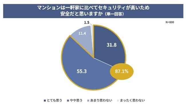 まず、マンションは一軒家に比べてセキュリティが高いため安全だと思うかを聞いたところ、「とても思う」「やや思う」を合わせると87.1%にのぼりました。マンションに暮らす多くの人が防犯性に対して安心感を抱いていることがわかりました。