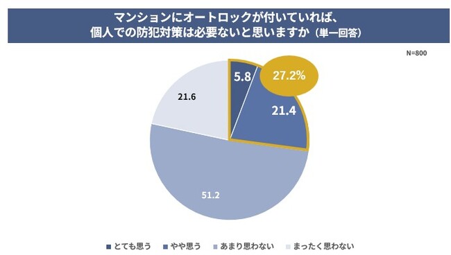 さらに、マンションにオートロックが付いていれば、個人での防犯対策は必要ないと思っている人は、「とても思う」「やや思う」を合わせると27.2%となり、2割以上の人がオートロックを過信し、個別の防犯対策は不要と考えていることが明らかになりました。