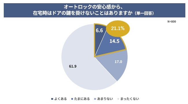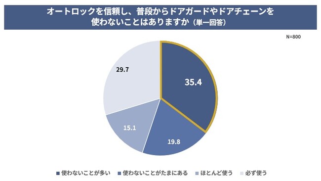 ■半数以上がオートロックを信頼し、ドアガードやドアチェーンを普段から使わないことがあると回答。さらに、在宅時にドアの鍵を掛けないことがある人も2割いることが明らかに。