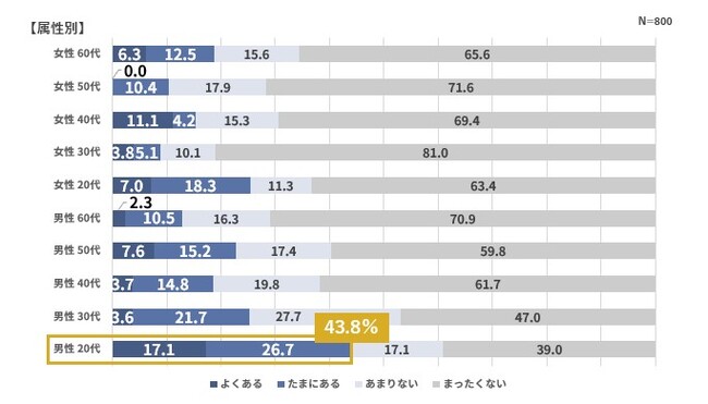 普段からドアガードやドアチェーンを使わないことがあるかを聞いたところ、35.4%の人が「使わないことが多い」と回答。中でも最も高い割合を示したのは20代女性で50.7%と2人に1人がドアガードやドアチェーンを普段から使っていないという結果に。意外にも若年層の女性が、マンションのセキュリティに対して過信している実態が浮き彫りとなりました。さらに、在宅時にドアの鍵を掛けないことがあるかを聞いたところ、「よくある」「たまにある」を合わせると21.1%となり、中でも「よくある」「たまにある」を合わせた割合が最も多いのは20代男性で43.8%という結果に。20代男性の4割以上の人が在宅時に施錠をしていないことが明らかになりました。在宅時の侵入など「在宅=安全」とは限らない昨今、日常の防犯行動の見直しが求められます。