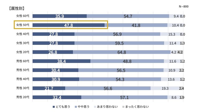 中でも50代女性では「とても思う」と回答した人が最も多く、47.8%となっています。