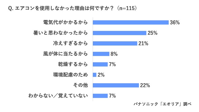 エアコンを使用しなかった理由については、「電気代がかかるから」36%が最多となり、続いて「暑いと思わなかったから」25%、「冷えすぎるから」21%が挙げられました。