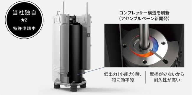 ★2:国内壁掛け形エアコンにおいて。アセンブルベーン機構と新規オイルの採用により低能力運転時に高効率な運転ができる技術。2024年12月1日時点。(当社調べ)