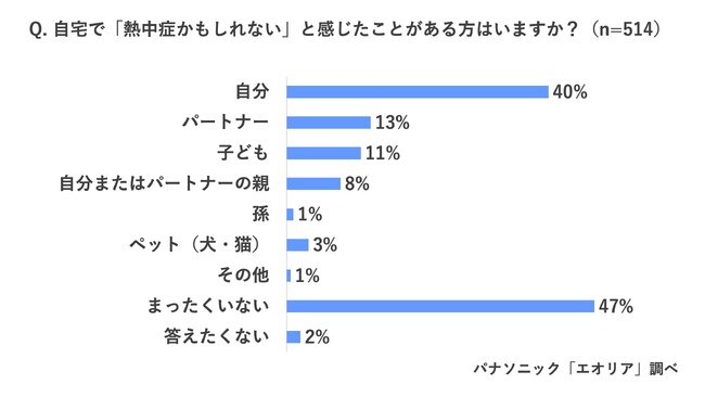 実際に、自宅で自身や家族が「熱中症かもしれない」と感じた経験の有無についてたずねたところ、「まったくいない」47%と「答えたくない」2%を除く、51%の方が経験があると回答しました。特に、ご自身が自宅で熱中症かもしれないと感じたことがある方は40%にのぼります。