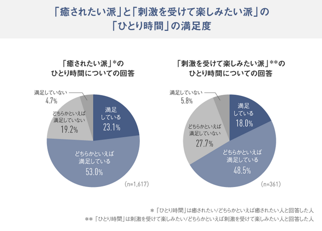 さらに、癒しを重視している人の「ひとり時間」の満足度は76.1%にのぼり、刺激を受けて楽しみたい派の66.5%よりも高い結果になりました。リラックスした時間を過ごすことが、「ひとり時間」の質を求める重要なファクターとなっていることがわかります。