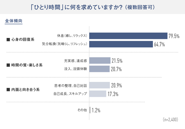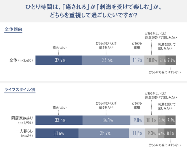 本調査では、「ひとり時間」に何を求めているかという質問に対し、79.5%もの人が「休息(癒し、リラックス)」と回答しました。癒しと刺激のどちらを重視したいかという質問にも、67.4%が「癒し」と回答しています。