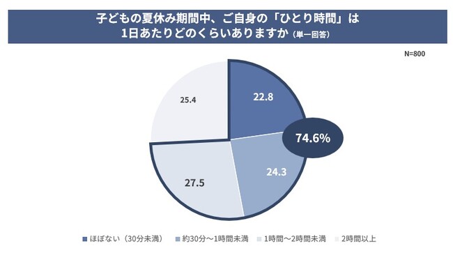 ■夏休み中、2人に1人が「普段よりストレスが増えた」と回答。理由として最も多いのは、”3食の準備” 、”子どもに常に付き合う必要がある”、”自分の時間が減る”と続き、働く親にとって、夏休みは“自分時間”が取りづらい状況に■夏休み中の親の“ひとり時間”、7割以上が「1日2時間未満」 と回答。さらに「ほぼない(30分未満)」と回答した人も2割超に。特に30代女性では、2人に1人と顕著な結果となり、家事や育児に追われる親のリアルな姿が浮き彫りに