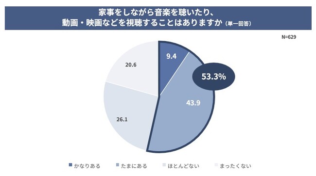 続いて、家事をしながら音楽を聴いたり、動画・映画などを視聴することはあるかを聞いたところ、「かなりある」「たまにある」と回答した人は合計で53.3%と、半数を超える結果となりました。マルチタスクに追われる子育て世代にとって、音楽や動画は“ながらリフレッシュ”には欠かせない存在となっているようです。