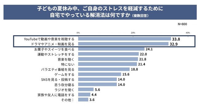 今回の調査結果から、子どもの夏休み期間中は家事の量が増えることから、「普段よりストレスが増えた」と感じている親が半数以上存在することがわかりました。また、自分だけの時間が「30分未満」と回答した人も2割存在し、特に30代女性では2人に1人が当てはまるなど、夏休み中の“自分時間不足”が深刻であることが浮き彫りとなりました。そんな中、自宅でのリフレッシュ方法として多かったのが「YouTubeで動画や音楽を視聴する」や「ドラマやアニメ・映画を見る」といったエンタメコンテンツの視聴で、日々の疲れを癒す手段として親しまれているようです。
