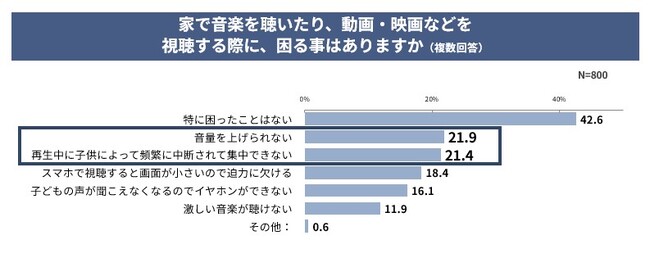 家で音楽を聴いたり、動画・映画などを視聴する際に、困ることはあるかを聞いたところ、「特に困ったことはない」と回答した人が42.6%で最も多い結果となりました。一方で、「音量を上げられない」が21.9%、「再生中に子供によって頻繁に中断されて集中できない」が21.4%と、それぞれ2割以上を占める結果に。視聴する際、家族に配慮して視聴音量を抑えたり、途中での中断により没入感が損なわれるといった窮屈な状況が、子育て世代のリアルな悩みとして浮き彫りになりました。