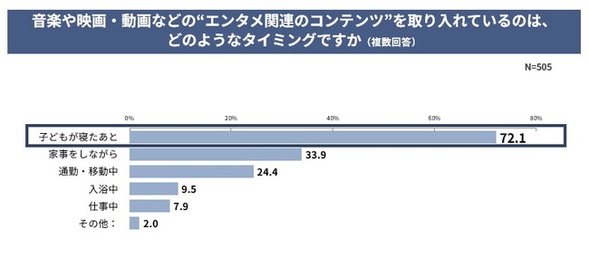 夏休み中、自宅でやっているリフレッシュ方法について聞いたところ、「YouTubeで動画や音楽を視聴する」が33.8%で最も多く、次いで、「ドラマやアニメ・映画を見る」が32.9%と続きました。視聴のタイミングについては「子どもが寝たあと」が72.1%と7割を超えています。