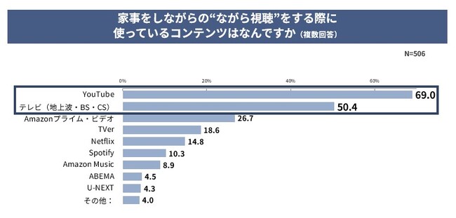 さらに、家事をしながらの“ながら視聴”をする際に使っているコンテンツを聞いたところ、「YouTube」が69.0%で最も多い結果に。次いで「テレビ(地上波・BS・CS)」が50.4%と続き、2人に1人がテレビを活用していることがわかりました。時間に制約がある中でも限られたスキマ時間を使って音楽や動画コンテンツを上手に取り入れている様子がうかがえます。