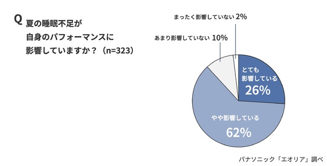 こうした状況の中、「夏の睡眠不足が自身のパフォーマンスに影響していますか?」という質問では、「とても影響している」26%、「やや影響している」62%と、88%が「睡眠不足が日中のパフォーマンスに影響を及ぼしている」と回答しました。