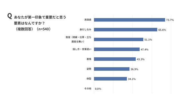 ■7割以上が「第一印象」に必要な要素として「清潔感」を重要視。次いで「身だしなみ」(65.6%)があがる。