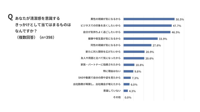 「清潔感」を意識するきっかけは「異性からの視線が気になる」が半数以上(50.5%)を占め、次に「ビジネスでの印象を良くしたい」(47.7%)が続く。
