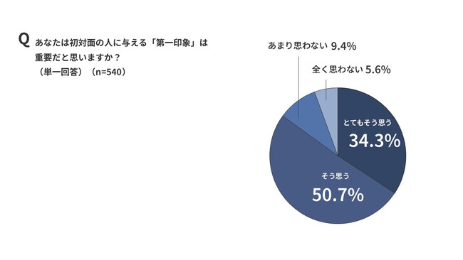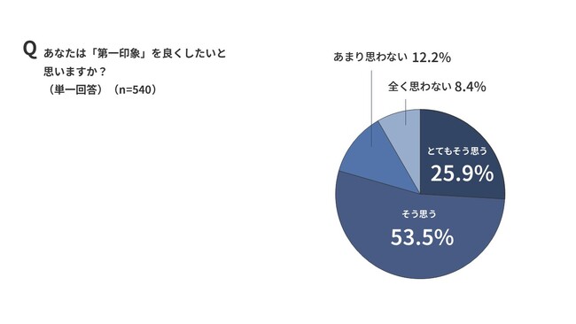 まず、初対面の人に与える「第一印象」は重要だと思うかを聞いたところ、「とてもそう思う」と「そう思う」を合わせると85.0%となりました。さらに「第一印象」を良くしたいかと聞いたところ、「とてもそう思う」と「そう思う」を合わせると79.4%となり、多くの人が「第一印象」が重要だと考えていることが明らかになりました。