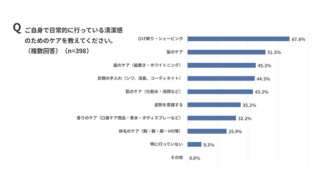 ■「清潔感」のためにしているセルフケアは、「ヒゲ剃り・シェービング」(67.6%)が最も多く、次いで「髪のケア」(51.5%)、「歯のケア」(45.2%)という結果に。