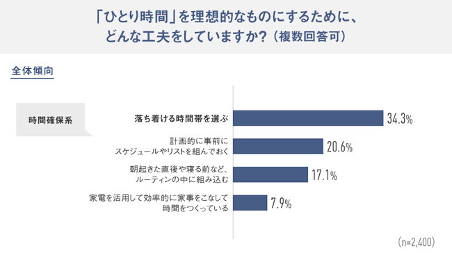 また、今回の調査では、「ひとり時間」を確保するために「落ち着ける時間帯を選ぶ」「スケジュールやルーティンに組み込む」といったさまざまな工夫がなされていることも明らかになりました。