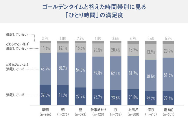時間帯別の満足度を比較してみると、朝~昼をゴールデンタイムにする人のほうが満足度が高く、8割を超える人が満足している結果に。とはいえ、数値に大きな開きはなく、時間帯による満足度への影響は少ないと考えられます。