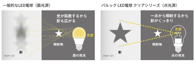 一般的なLED電球では、複数の光源によって発光させる仕組みのため、光が拡散し発光面積が大きくなります。その結果、照明器具に取り付けた際には壁などに映る影がぼやけやすく、きらめきや陰影の演出には適していませんでした。