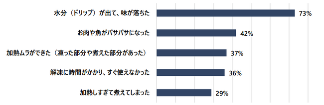 同調査で「ふるさと納税で届いた冷凍の食材を解凍する際に、失敗したことはありますか?」と尋ねたところ、約4割が「ある」と回答。さらに失敗経験のある人が挙げた内容として最も多かったのは「水分(ドリップ)が出て味が落ちた」で、次いで「お肉や魚がパサパサになった」、「加熱ムラができた」と続きました。Q. ふるさと納税で届いた冷凍食材を解凍する際、どのような失敗を経験しましたか?(n=89・複数回答)
