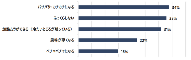 同調査で、選択経験のある返礼品の上位3位に入る“お米”。炊いたごはんを冷凍保存する人も多く、約8割が解凍時に不満を感じていると回答しました。その中でも「パサパサ・カチカチになる」、「ふっくらしない」などの悩みが挙げられました。Q. 冷凍ごはんの解凍で、不満に感じることはありますか?(n=265)
