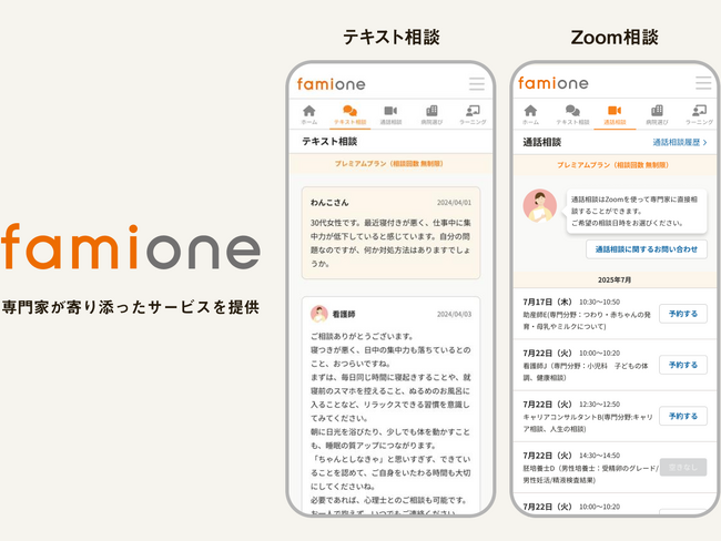 株式会社ファミワンと連携し、看護師・薬剤師・臨床心理士など50名以上の専門家へ、テキスト&ビデオ通話で無料相談できる。体調管理や妊活をはじめ、あらゆるお悩みや不安に専門家が伴走。