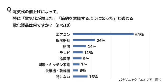 ・「電気代値上げで特に“電気代が増えた”“節電を意識するようになった”電化製品」はエアコンが最多(64%)