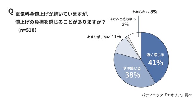 続いて「電気料金値上げの負担を感じることがありますか?」という質問でも、「強く感じる」41%、「やや感じる」38%と、79%が負担を実感していることがわかりました。